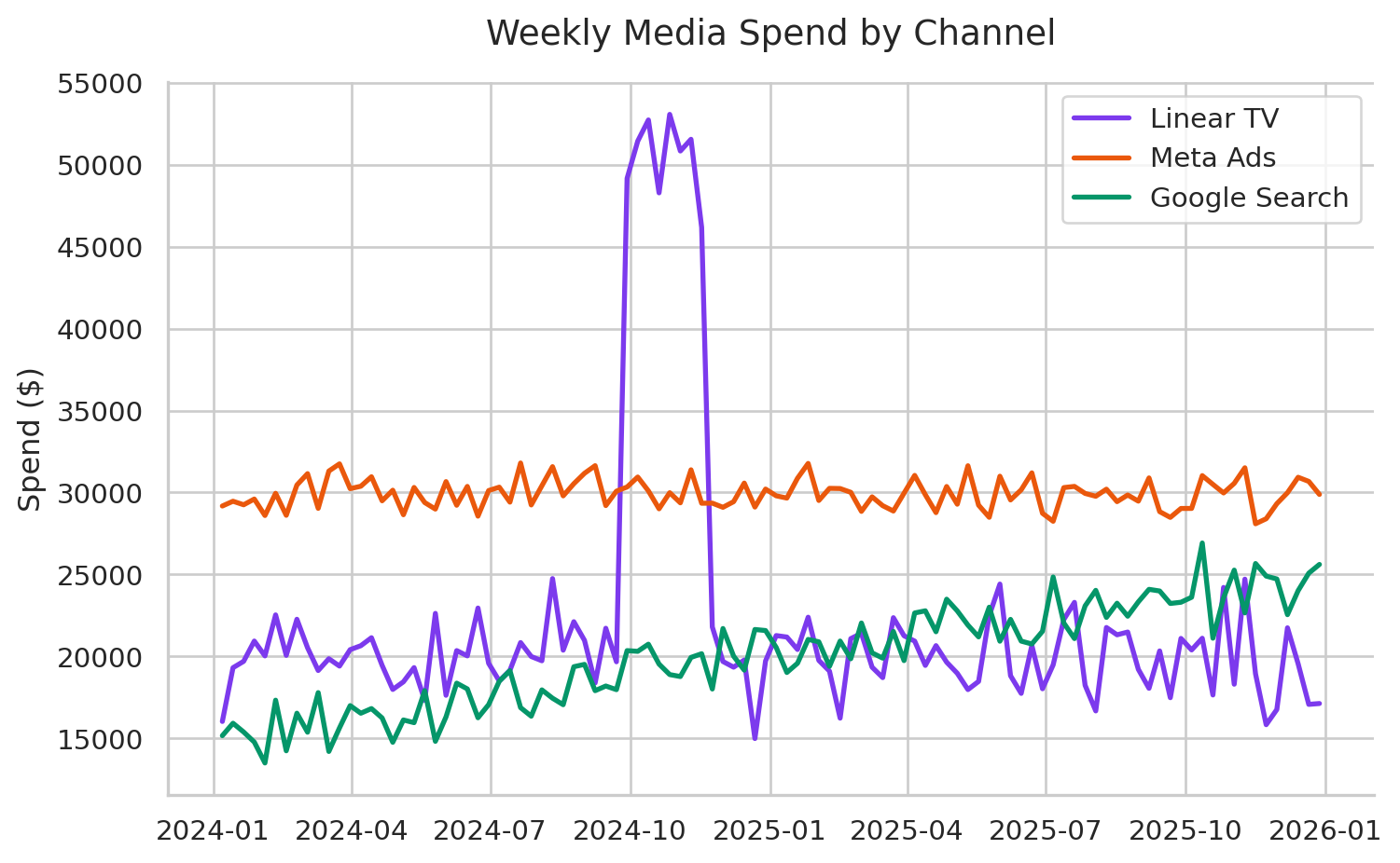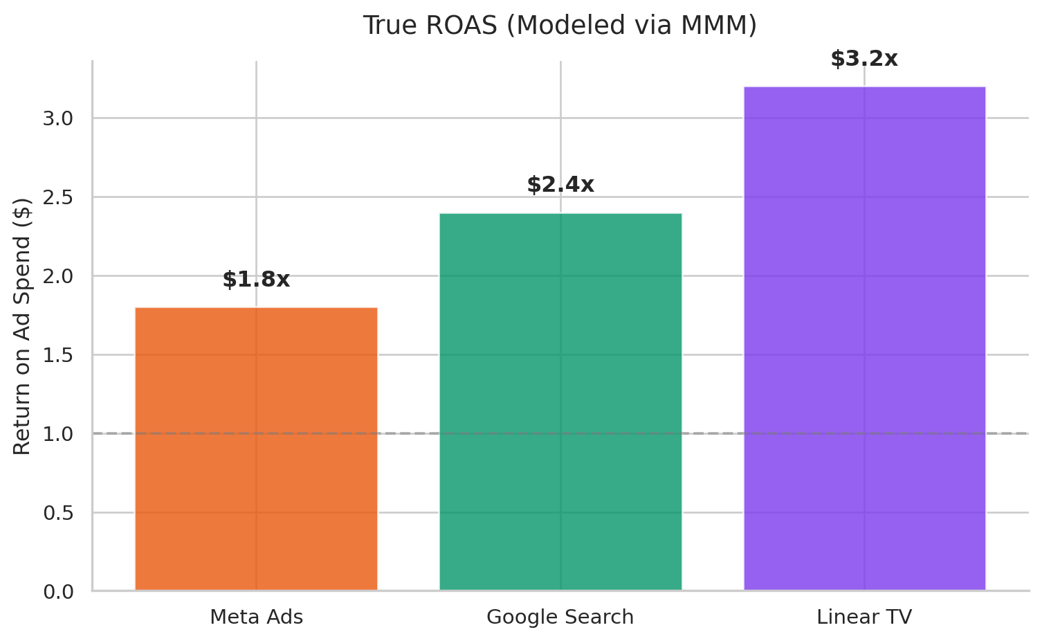 Following iOS privacy updates, our standard last-click attribution model began failing. The marketing team was spending $5M across Meta, Google Ads, and linear TV, but couldn’t accurately prove incrementality. We deployed a Bayesian Marketing Mix Model (MMM) to take a top-down view of our spend and revenue.